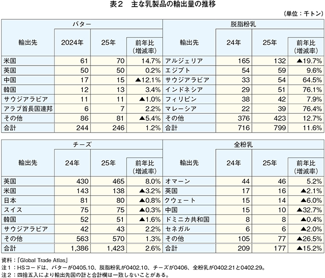 欧州委員会によると、2025年のEU域外向け乳製品輸出量は、バターが前年比1.2%増、脱脂粉乳が同11.6%増、チーズが同2.6%増と、いずれも前年を上回った。一方、全粉乳は同15.2%減と、前年をかなり大きく下回った(表2)。