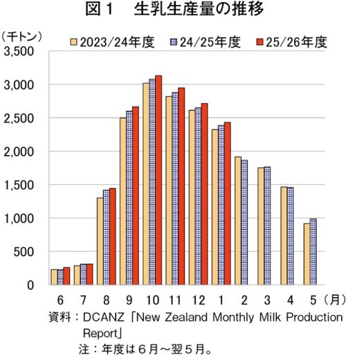 ニュージーランド乳業協会(DCANZ)によると、2026年1月の生乳生産量は243万2000トン(前年同月比2.0%増)と、9カ月連続で増加した(図1)。また、2025/26年度(6月〜翌5月)の1月までの生乳生産量も、1590万5000トン(前年比2.3%増)と前年度を上回って推移している。