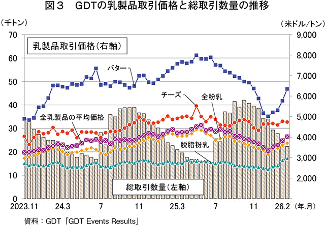 2026年2月17日開催のGDT(注1)平均取引価格は、チーズを除く主要3品目が前回開催時(26年2月3日)を上回った(図3)。取引全体では、全乳製品の平均取引価格は1トン当たり4028米ドル(63万1631円、1米ドル=156.81円(注2)、前回比5.2%高)とやや上昇した。NZなど主要乳製品生産地域での堅調な生産により供給が増加している中、バターは堅調な需要が見られた。また、脱脂粉乳価格の上昇要因についてNZXは、米国での乳固形分ベースのチーズ仕向けの増加による脱脂粉乳在庫のひっ迫が影響したとみている。一方、チーズは中国が欧州産チーズに課していた輸入関税の一部を引き下げたことで、NZ産チーズとの競争力が低下し、前回開催時の価格を下回ったとみている。