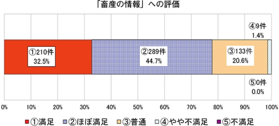「畜産の情報」への評価(5段階)は、「満足」が32.5%、「ほぼ満足」が44.7%、「普通」が20.6%となりました。また、5段階評価の評点の平均値は4.09でした。