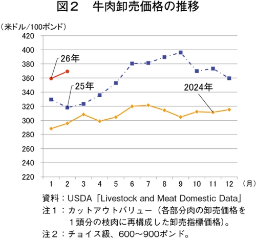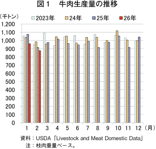 米国農務省全国農業統計局(USDA/NASS)によると、2026年2月の牛と畜頭数は217万頭(前年同月比6.6%減)とかなりの程度減少した。一方、同月の1頭当たり枝肉重量は406.4キログラム(同2.5%増)とわずかに増加した。この結果、同月の牛肉生産量は87万7000トン(同4.3%減)とやや減少した(図1)。と畜頭数の減少について、米国農務省経済調査局(USDA/ERS)によれば、一部と畜場が稼働率向上による営業利益の改善のために、肥育牛と畜の操業日数を縮小していることが要因の一つであるとされている。
