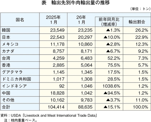 USDA/ERSによると、2026年1月の牛肉輸出量は8万8635トン(前年同月比15.1%減)とかなり大きく減少した(表)。なお、中国向けについては中国海関総署(GACC)による更新期限を迎えた米国内の中国向け牛肉輸出施設登録の更新が引き続き行われていないことにより