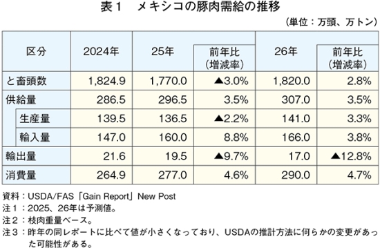 米国農務省海外農務局(USDA/FAS)は2026年2月26日、25年および26年におけるメキシコの豚肉需給見通しを発表した。これによると、25年は24年に発生した豚繁殖・呼吸障害症候群(PRRS)や豚流行性下痢(PED)といった疾病の影響や収益性の悪化により、中・小規模の農家を中心に飼養頭数が十分に確保できなくなったことから、豚と畜頭数は1770万頭(前年比3.0%減)とやや、豚肉生産量は136万5000トン(同2.2%減)とわずかに、いずれも減少が見込まれている(表1)。26年は、生産コストの安定化、25年後半の耐病性を考慮した品種の導入による1腹当たりの産子数の増加が見込まれることなどから、飼養頭数が回復し、と畜頭数が増加するとみられる。このため豚肉生産量は141万トン(同3.3%増)とやや増加すると見込まれている。