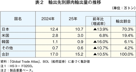 25年の豚肉輸出量は前年比10.5%減、輸入量は同10.4%増