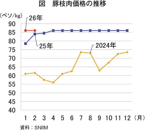 (注)、前年同月比2.4%高)とわずかに上回った(図)。国内の供給不足を背景に豚枝肉価格は高止まりしているものの、牛肉と比べると比較的手頃な価格を維持している。一方、同月の生体豚価格は、同45.9ペソ(451円、同17.9%安)と大幅に下回った。