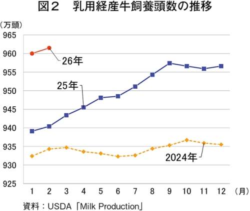 米国農務省全国農業統計局(USDA/NASS)によると、2026年2月の乳用経産牛飼養頭数は961万5000頭(前年同月比2.2%増)とわずかに増加した(図2)。アイダホ州、テキサス州、カンザス州、サウスダコタ州、ニューヨーク州などで乳製品の加工能力の向上が見られることや、乳価が下落傾向にある中でも肉用種との交雑子牛(ビーフ・オン・デイリー) の販売による収益が得られることにより、頭数が増加しているとみられる。