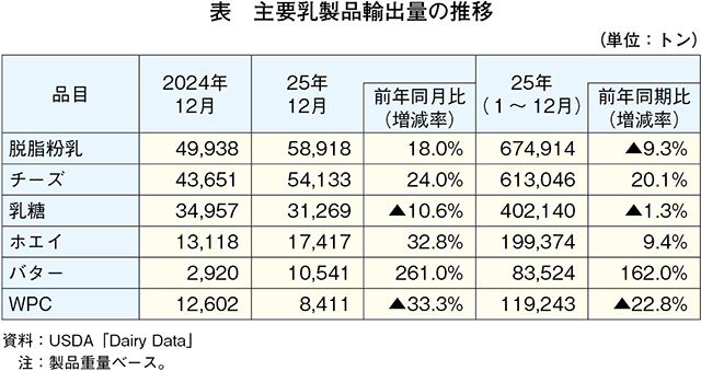 25年12月の乳製品輸出量は多くの品目で前年同月を上回る
