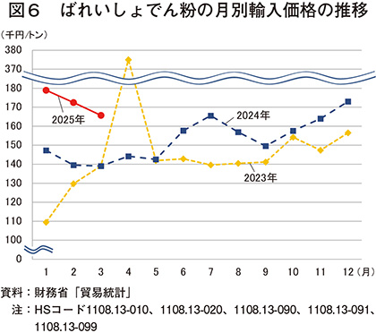 財務省「貿易統計」によると、2025年3月のばれいしょでん粉の輸入量は1684トン(前年同月比2.3倍、前月比29.2%減)と、前年同月から大幅に増加した(図5)。