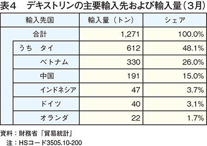 デキストリンの輸入先は8カ国・地域で、直近4カ月はタイからの輸入が全体の半数程度のシェアを占めている。