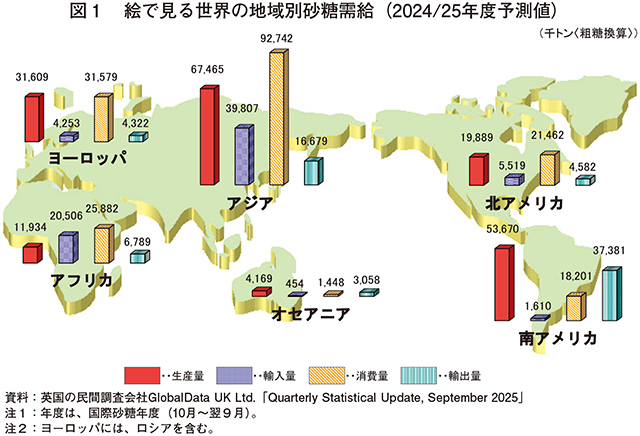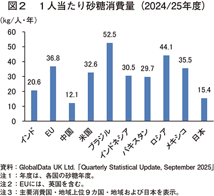 この結果、期末在庫率は前年度から1.8ポイント減少し、42.2%と見込まれている。地域別の砂糖需給の予測値は、図1の通りである。また、主要消費国・地域の1人当たり砂糖消費量は図2の通りである。