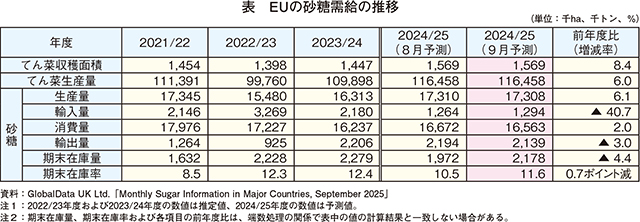 砂糖生産量は、てん菜増産を背景に1731万トン(同6.1%増)とかなりの程度増加が見込まれている。砂糖輸入量は、域内の増産とウクライナ産砂糖への輸入制限が設けられる見込みであることなどから、129万トン(同40.7%減)と大幅な減少が見込まれている。