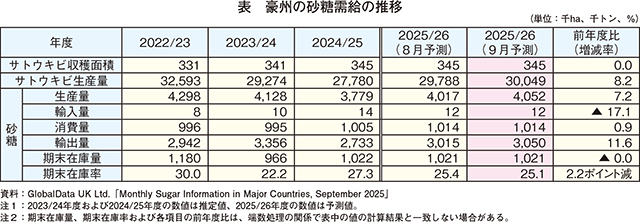 2025/26年度(4月〜翌3月)のサトウキビ収穫面積は、35万ヘクタール(前年度比0.0%増)と前年度並みが見込まれている(表)。サトウキビ生産量は、一定の労働力が確保されたことに加え、前年度と比較してより生育に適した季節的条件が整うとの見通しから、3005万トン(同8.2%増)とかなりの程度増加が見込まれている。一部地域では過湿による収穫遅延があったものの、7月の降水量が平年を大幅に下回ったことで収穫進度が加速し、現在は収穫の約25%が完了しているとされる。また、年初に甚大な洪水被害があったクイーンズランド州の主産地の一つであるハーバート地域では、一部で軽微な品質問題が見られたものの、サトウキビの生育は全体的に良好とされている。