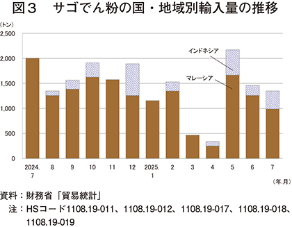 財務省「貿易統計」によると、2025年7月のばれいしょでん粉の輸入量は1855トン(前年同月比27.3%減、前月比7.6%減)と、前年同月から大幅に減少した(図5)。