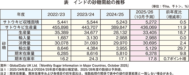 2025/26年度(10月〜翌9月)のサトウキビの収穫面積は、123万ヘクタール(前年度比4.2%増)とやや増加が見込まれている(表)。サトウキビ生産量は、主産地で多雨が懸念されているものの、サトウキビの生育は良好とされ、7949万トン(同8.1%増)とかなりの程度増加が見込まれている。