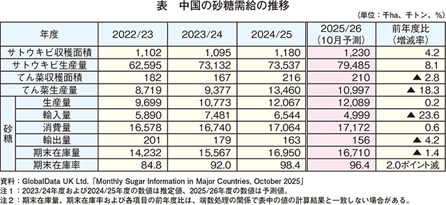 2025/26年度の砂糖生産量はやや、輸入量はかなりの程度減少する見込み