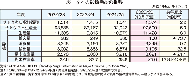 2025/26年度の砂糖生産量はかなりの程度、輸出量はやや増加する見込み