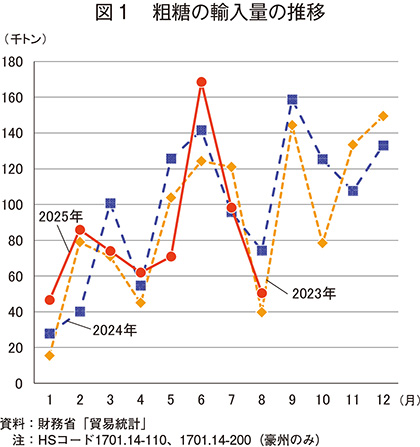 財務省「貿易統計」によると、2025年8月の甘しゃ糖・分蜜糖(HSコード 1701.14-110)および甘しゃ糖・その他(同1701.14-200の豪州。以下同じ)の輸入量は、5万507トン(前年同月比31.9%減、前月比48.6%減)であった(図1)。