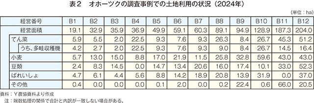 十勝管内東部・東北部の4町において多畦収穫機を利用する事例の概況を、表1に示した。十勝の調査事例では、2台の多畦収穫機が利用されており、同一の大規模農業法人が双方に関与している。1台が、浦幌町で機械利用組合が組織され5経営での共同利用、もう1台が農業法人を中核として利用され、受託作業でも活用されている。なお、この農業法人は双方に関与しており、表1の浦幌町の400ヘクタール規模の経営と同一の法人である。