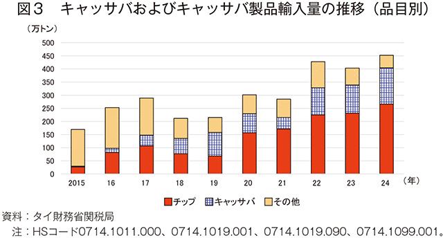 直近ではCMDの被害拡大、長期的にはタイのキャッサバ産業進展により、将来的には同国内でのキャッサバが不足する可能性があるため、周辺国からのキャッサバ輸入を許可する政策の整備が求められるとしている。今後、同国のキャッサバ価格は、国内需給よりもキャッサバ製品の国際市場価格に左右されるとしており、国際競争力維持のため原料調達先の多様化が不可欠であると考えられる。