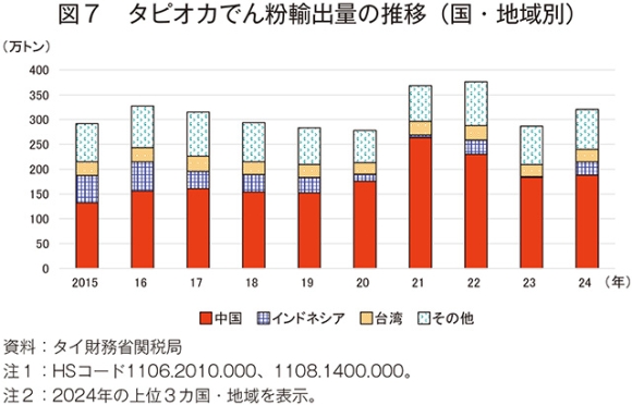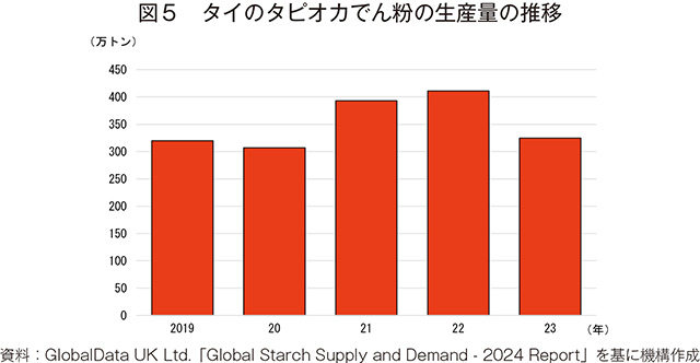 英国の調査会社であるGlobalData UK Ltd.によると、近年のタイのタピオカでん粉生産量は増加傾向で推移していたが、直近2023年のでん粉生産量は325万トン(前年度比21.0%減)と前年に比べ大幅に減少した(図5)。タイ国内には100以上のでん粉工場があるとされ、このうち、同国最大のキャッサバ生産地であるナコンラチャシマ県には26のでん粉工場が立地している。