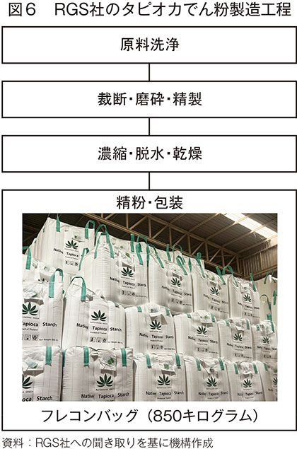 RGS社のタピオカでん粉の製造工程は、1)集荷したキャッサバから砂などを取り除き洗浄、2)洗浄したキャッサバを粉砕し、でん粉と他の物質を分離、3)でん粉から不純物を取り除く処理をした後、脱水・乾燥させ水分を13%以下に調整、4)乾燥させたでん粉をふるい機で検査し、基準を満たしたでん粉を計量して包装−となっている(図6)。同工場で生産されるでん粉はすべて天然でん粉であり、2〜3年前は食品用と工業用がそれぞれ50%ずつ生産されていたが、直近では95%が食品用となっている。これは海外需要の高まりに応えた結果であり、食品用の8割は中国、マレーシアおよび台湾などに輸出される。食品用はカップ麺、乾麺、タピオカパールや練り物に、工業用は製紙や衣料繊維に使用され、用途によって品質水準が設定されている。