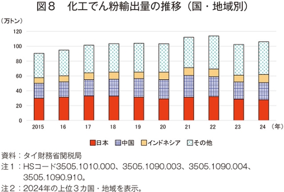 近年、タイのタピオカでん粉輸出量は300万トン程度で推移している(図7)。2024年は321万トン(前年比11.7%増)で、輸出先上位のいずれも前年から増加した。内訳は、最大の輸出先である中国向けが188万トン(同2.2%増)、次いでインドネシア向けが27万トン(同19.2倍)、台湾向けが25万トン(同4.0%増)となった。化工でん粉輸出量は100万トン程度で推移している(図8)。24年は106万トン(同3.6%増)で、輸出先上位のうち日本以外は前年から増加した。内訳は、最大の輸出先である日本向けが28万トン(同3.1%減)、次いで中国向けが23万トン(同0.2%増)、インドネシア向けが11万トン(同19.9%増)となった。