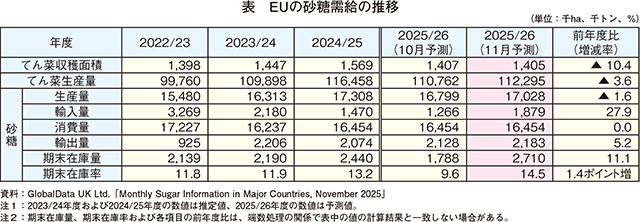 2025/26年度(10月〜翌9月)のてん菜収穫面積は、生産量上位国であるフランス、ドイツ、ポーランドを中心に各国で減少が見込まれることから、141万ヘクタール(前年度比10.4%減)とかなりの程度減少が見込まれている(表)。てん菜生産量は、フランスが単収の向上、ドイツが糖度の改善をそれぞれ見込んでいるものの、作付面積の減少により、1億1230万トン(同3.6%減)とやや減少が見込まれている。
