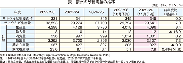 2025/26年度の砂糖生産量はかなりの程度、輸出量は大幅な増加見込み
