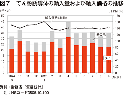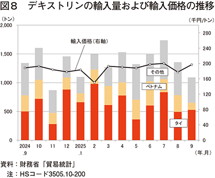 財務省「貿易統計」によると、2025年9月のでん粉誘導体の輸入量は、3万4875トン(前年同月比9.8%増、前月比9.7%増)と、前年同月からかなりの程度増加した(図7)。