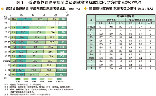 現在、トラック運転手の不足および高齢化が進んでおり、令和4年度の就業者は、約86万人となっており、男性労働力への依存度が高いだけでなく、高齢化も進んでいます。