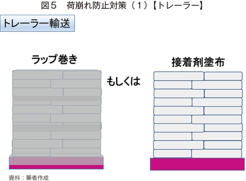 なお、コンテナには、五つのパレットを積みますが、真ん中のパレットがズレやすいため、トラック底辺とパレットの間にグリップシートを敷くことでズレ防止を図ることとしました(図5および図6)。