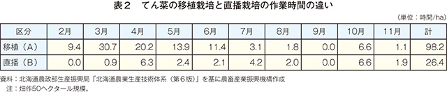 てん菜には、春先にハウスで育苗作業を行う移植栽培と、直接圃場に種子をまく直播栽培の二つの方法がある。近年は、育苗作業を必要とせず、労働時間の短縮が可能な直播栽培の割合(直播率)が全道的に増加している(図5、表2)。このように、てん菜栽培に係る労働時間の短縮が図られている一方で、依然として輪作主要4品目の中で労働時間は最も長く、生産者が作付けを敬遠しがちな要因の一つにもなっている。