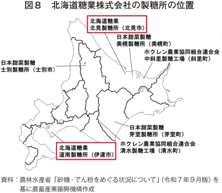 北海道糖業株式会社(以下「北糖」という)は、芝浦精糖株式会社・台糖株式会社・大日本製糖株式会社(現DM三井製糖株式会社)のてん菜糖部門を分離統合し、昭和43年2月5日に設立された。そして同年4月、上記各3社のビート糖事業部門に属する営業の一切を譲り受けて発足した。製糖所は、北海道北見市の北見製糖所、伊達市の道南製糖所の2カ所で、本別町の本別製糖所は令和5年3月に砂糖生産を終了し、その後はてん菜の受け入れや製品管理などを行う本別事業所となっている(図8)。