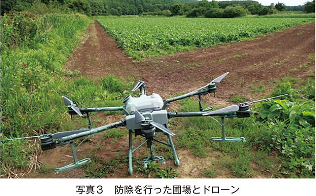 なお、うち1戸はドローンによる散布を5回、もう1戸では4回の散布を実施し、延べ面積で45ヘクタールの防除を行った。