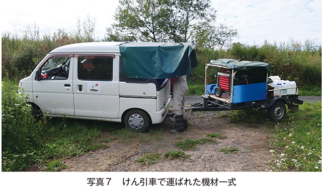 一方でドローンの場合には、バッテリー、水(最大で30リットル)、薬剤、ドローン本体を車1台で運搬できるため、機動的である(写真7、調査時は軽自動車にけん引車を付けて機材一式を運搬)。圃場に到着すると、その場で薬剤を水で希釈してタンクに入れ、ドローンにセットしてすぐに作業を開始できるので、準備も10分程度で完了する。水もポリタンクに入れて持参するため、作業者も1人で準備することが可能である(写真8)。