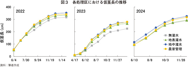 試験期間中は定期的に調査を行い、灌水処理によるサトウキビ成育への影響を調査した。いずれの年度においても灌水の効果が認められたが、特に23年度は、灌水区の仮茎長が無灌水区を大きく上回った(図3)。また、いずれの年度においても地中灌水区が最も高い値となり、次いで農家管理区、地表灌水区、無灌水区の順となった。無灌水区と地中灌水区の仮茎長差は、22年度、23年度、24年度において、それぞれ36センチメートル、53センチメートル、37センチメートルであった。