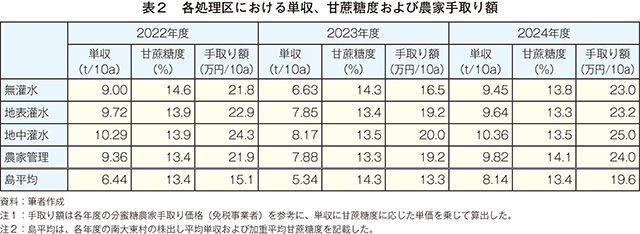 生産実績に基づく各処理区の単収、甘蔗糖度および農家手取り額を表2に示す。生育調査結果同様、いずれの年度においても灌水を行うことによって単収が向上したが、最も単収が高かったのは、いずれの年度においても地中灌水区であった。特に大干ばつ年度であった23年度は、無灌水区の単収を10アール当たり1.5トン以上、上回る増収となった。地中灌水区は、地表灌水区と灌水量に多少の差はあるものの、同0.3〜0.7トン高い単収を記録したことから、チューブの移動に関わる労働力削減効果だけでなく、灌水による増収効果もより高いことが明らかとなった。また、農家管理区との比較から、同じ地中灌水であっても、微気象データに基づく精密な灌水管理を行うことで、灌水量は少なくともより高い単収を得られることが分かった。甘蔗糖度に関しては、灌水区でやや低くなる傾向が見られ、地表灌水区および農家管理区の手取り額は無灌水区と大きく変わらない年度も見られた。一方、地中灌水区は、常に無灌水区よりも10アール当たり2万円以上高い手取り額を産出しており、収益性も最も高い灌水方法であったと考えられる。なお、試験圃場を所有する農家は、島内でも篤農家(熱心で研究心旺盛な農家)として知られており、そもそも無灌水区の単収が島平均を大きく上回っていることから、一般的な単収を記録する圃場を対象に試験を行っていれば、灌水処理の効果がより顕著に表れていた可能性があることを補足させていただきたい。