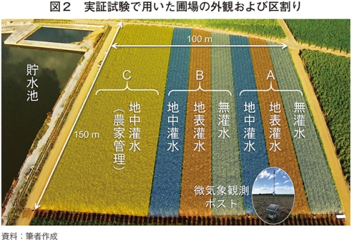 3)、今回は(3)ドリップチューブ埋設による地中点滴灌水に着目した試験設計となっている。およそ1.5ヘクタールの圃場をA〜Cの3ブロックに分割し、そのうちA・Bブロックに無灌水区、通常の点滴灌水を行った地表灌水区、チューブを埋設した地中灌水区を設けた(図2)。これらの灌水区は、圃場横に設置した微気象観測ポストのデータを用いて、筆者自身が灌水管理を行った。一方、Cブロックはすべて地中灌水だが、圃場所有者である農家によって灌水管理が行われた。これによって、無灌水と灌水の比較、地表灌水と地中灌水の比較、農家による慣行灌水とスマート灌水の比較などが行える。なお、試験は21年に春植えを行った農林26号の株出し栽培圃場を用いて、22〜24年度にかけて行われた。