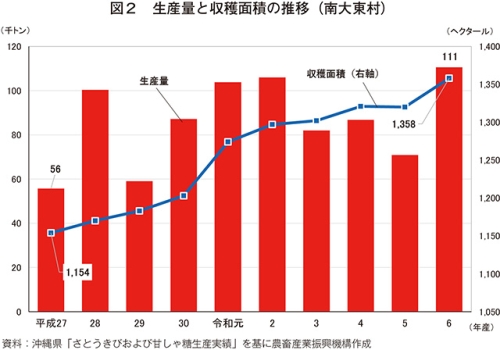 沖縄県南大東島におけるサトウキビの生産量は、令和6年産は過去70年で最大規模の豊作となる11万611トン(単収:10アール当たり8142キログラム)を記録した。また、県全体としては生産者数が減少する中で、南大東島における生産者戸数は近年増加傾向にある。