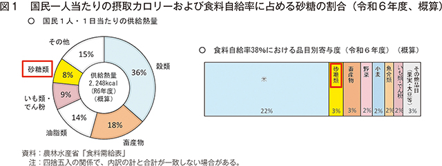 砂糖は菓子類、パン、飲料、各種調味料など、私たちの食生活のあらゆる場面で利用されている基礎的な食料原料です。また、国民の摂取カロリー全体の約8%を占めるなど、日常のエネルギー源として重要な役割を果たしているほか、食料自給率への寄与度も高く、国民の食生活に欠かせない存在です(図1)。