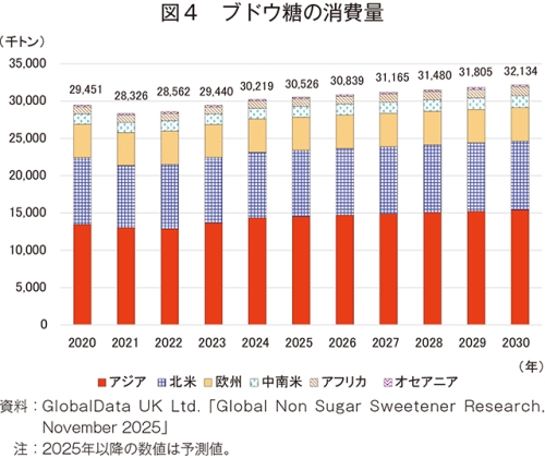 24年の消費量は、3021万9000トン(20年比2.6%増)とわずかに増加した(図4)。今後もすべての地域で堅調な需要が続き、30年には3213万4000トン(24年比6.3%増)とかなりの程度の増加が見込まれている。地域別では、増産を背景に最大の消費国である中国を含むアジアが1540万4000トン(同7.3%増)に達する見込みである。
