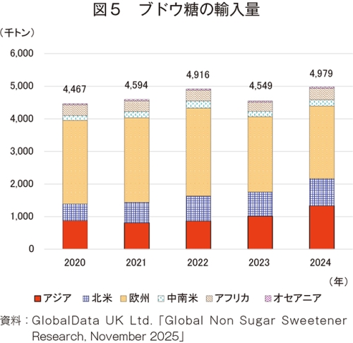 24年の輸入量は、生産量および消費量の増加に伴い、497万9000トン(20年比11.5%増)とかなり大きく増加した(図5)。地域別では、韓国の輸入増加などによりアジアが133万6000トン(同52.9%増)、米国とメキシコの輸入増加などにより北米が82万9000トン(同59.4%増)と、いずれも大幅に増加した。一方、24年の輸入量全体の4割以上を占める欧州は、222万7000トン(同12.8%減)とかなり大きく減少した。欧州は、生産量ではアジアや北米に劣るものの、EU域内の取引が活発である。