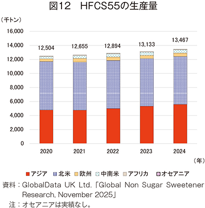 24年のHFCS55の消費量は、1346万5000トン(20年比7.7%増)とかなりの程度増加し、30年には1435万8000トン(24年比6.6%増)とかなりの程度増加が見込まれている(図14)。地域別では、欧州を除く全地域で増加見込みである。