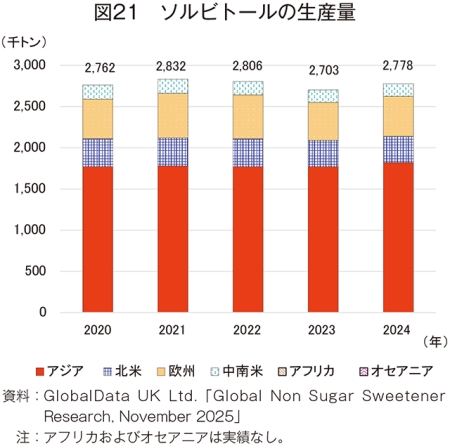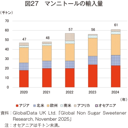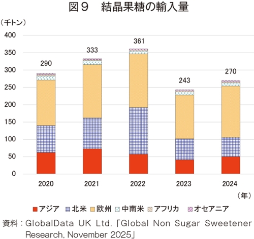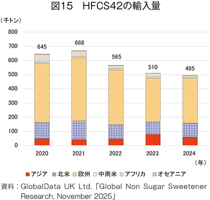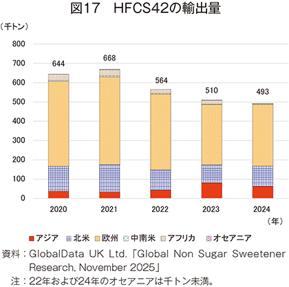 24年のHFCS42の輸入量は、49万5000トン(20年比23.3%減)と大幅に減少した(図15)。地域別では、アジア(同22.9%増)が唯一の増加となり、輸入量全体の6割以上を占める欧州(同24.2%減)、2割を占める北米(同14.7%減)は減少となった。その結果、輸入量全体も減少傾向となった。