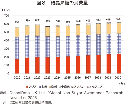 24年のHFCS42の消費量は、630万8000トン(20年比3.6%減)とやや減少した(図13)。30年には639万8000トン(24年比1.4%増)とわずかな増加が見込まれているが、20年比で見ると、2.2%減と長期的には減少が見込まれている。地域別では、米国の消費量減少により、最大の生産および消費地域である北米が292万7000トン(同1.1%減)とわずかな減少が見込まれている。これに対し、アジアは中国の堅調な需要により、236万8000トン(同3.7%増)とやや増加が見込まれているものの、20年から24年までの増加率と比較すると増加率は減少傾向にあり、消費の鈍化がうかがえる。