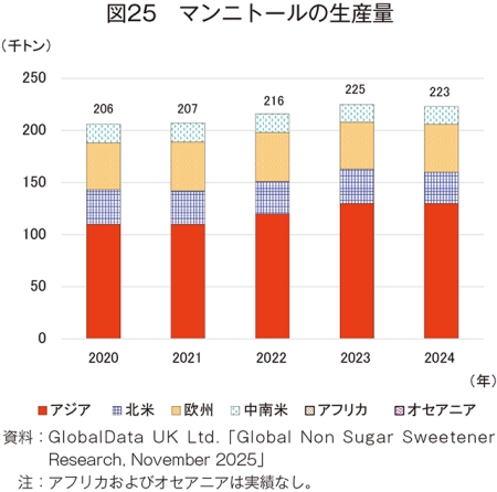 ソルビトールは、すべての地域で輸入価格が上昇し、輸出価格は北米を除くすべての地域で上昇した。特に、23年は欧州の輸出価格により急騰した。24年の輸出入価格が最も安い地域はアジアであった。
