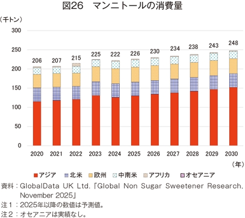 24年の消費量は、22万2000トン(20年比7.8%増)とかなりの程度増加し、さらに、30年には24万8000トン(24年比11.7%増)とかなり大きな増加が見込まれている(図26)。地域別では、最大の生産地域であるアジアが15万2000トン(同20.6%増)と大幅な増加が見込まれているが、アジア以外の地域は、いずれも24年の消費量が据え置かれている。