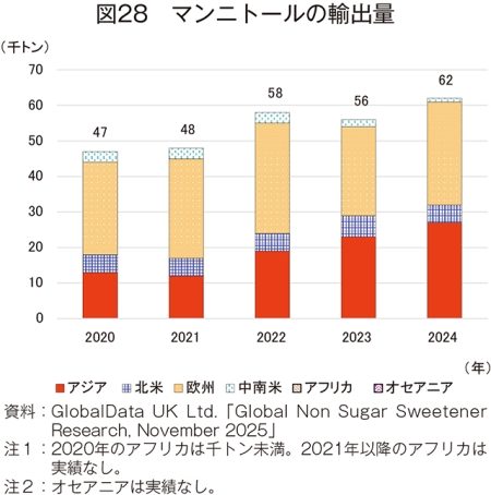 24年の輸出量は、94万6000トン(20年比21.0%増)と大幅に増加した(図24)。地域別では、中国やインドの輸出増加により、アジアが58万トン(同42.9%増)と大幅に増加したが、欧州は33万7000トン(同0.3%減)と20年並みであった。