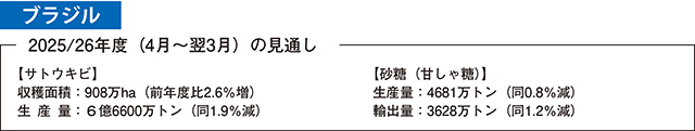 2025/26年度(4月〜翌3月)のサトウキビ収穫面積は、908万ヘクタール(前年度比2.6%増)とわずかな増加が見込まれている(表)。しかし、サトウキビ生産量は、前年度の火災や干ばつ、25年6月と7月に中南部で局所的に発生した霜害などの影響により、6億6600万トン(同1.9%減)とわずかな減少が見込まれている。