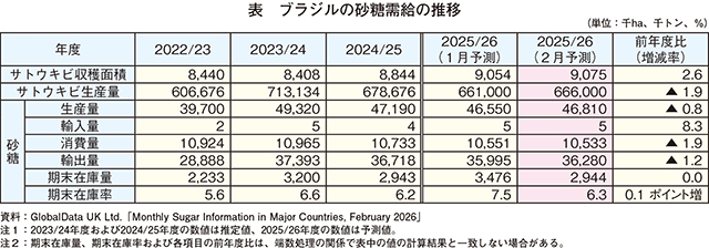 砂糖生産量は、世界の砂糖相場下落やエタノール30%混合(E30)義務付けによるエタノール需要の増加などを背景に1月以降、サトウキビの砂糖への仕向け割合が低下したことなどから、4681万トン(同0.8%減)とわずかな減少が見込まれている。砂糖輸出量は、3628万トン(同1.2%減)とわずかな減少が見込まれているが、引き続き国際市場でのブラジル産砂糖に対する堅調な需要が見込まれている。